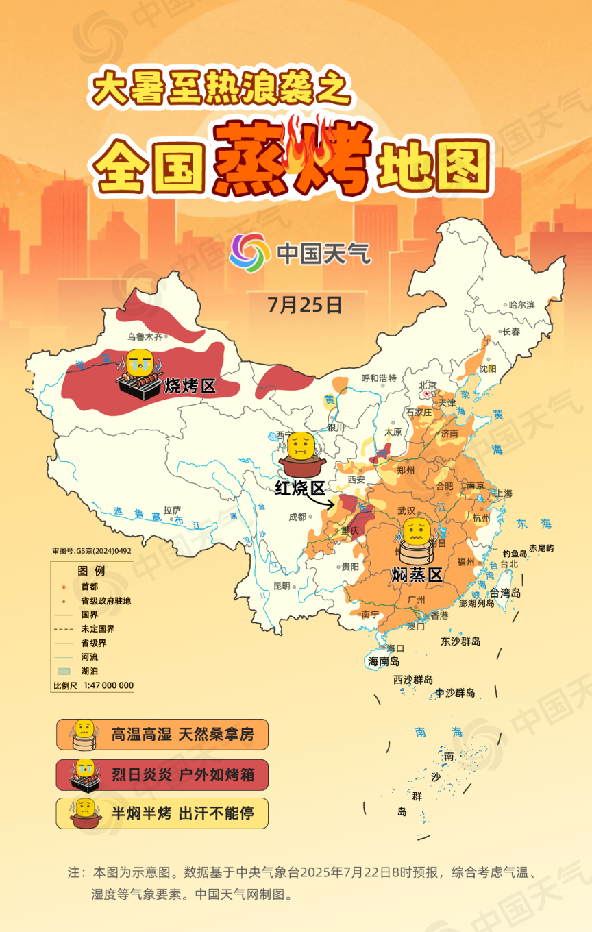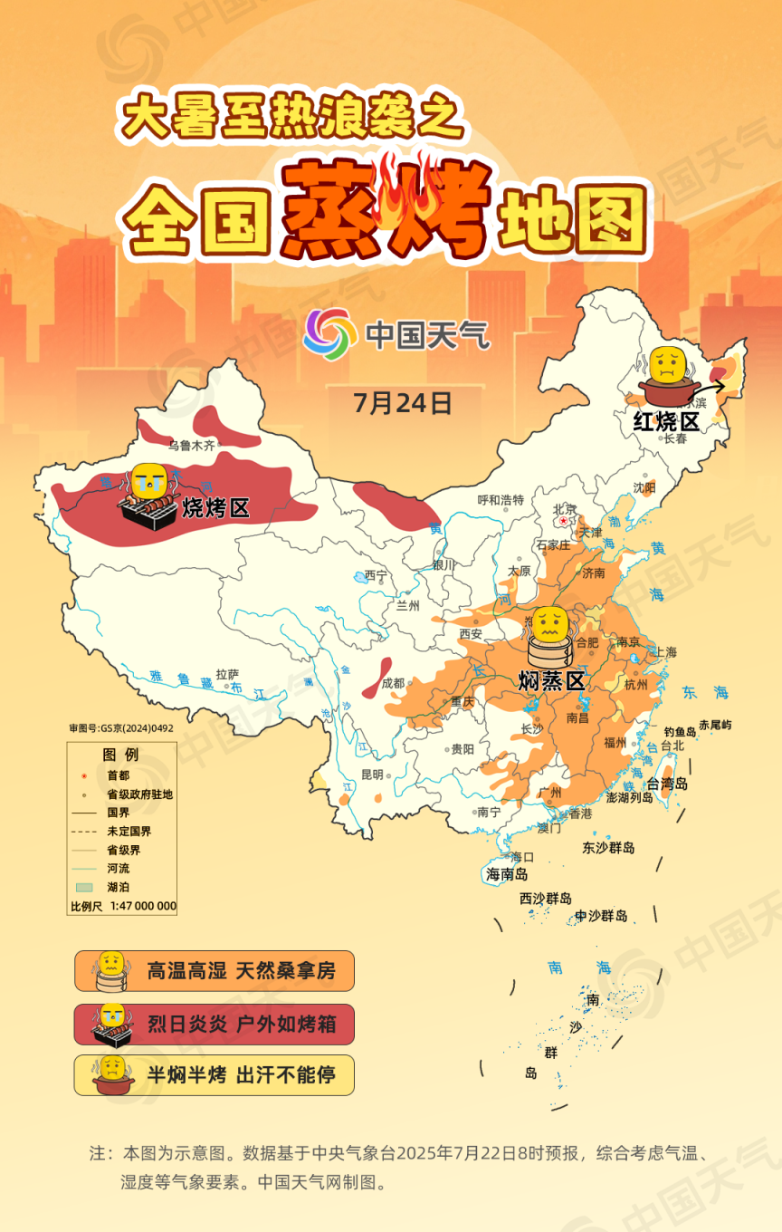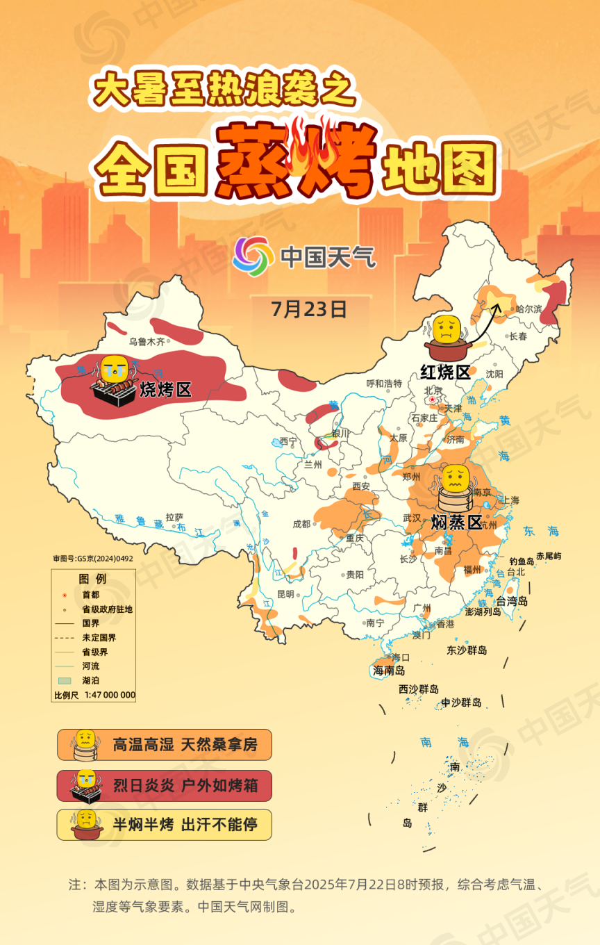 大暑前后,暑气正浓,稍一动弹就容易汗湿衣衫。今天(7月22日),我国正式进入大暑节气,三伏天的大幕也已拉开,意味着一年中最热的时段到来。明起三天,多地高温天气发展增强,中东部十余省区市将遭遇“上蒸下煮”的桑拿天,新疆等地则持续“烈日炙烤”模式。中国天气网特别推出全国蒸烤地图,看你家会热成啥样。